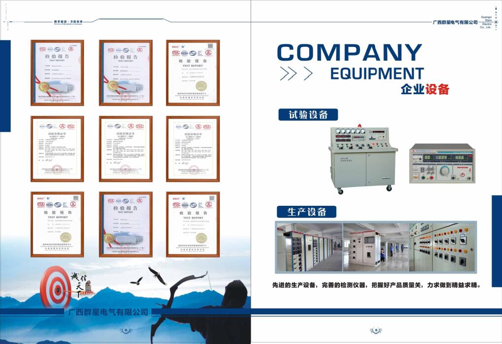 廣西群星電氣有限公司是與廣西三昭電氣公司合并重組后的新公司,是一家生產高低壓成套電器設備,節能設備及改造的企業,公司地址于我國華南區最大的內河港口——貴港市港北區,生產設施專業、齊全、技術力量雄厚,測試設備先進,主要產品有:YBW系列箱式變電站、低壓抽出式開關柜GCS、低壓固定柜GGD、低壓無功補償裝置GGJ、動力柜XL-21和各種型號的三箱產品及各種柜體、電力變壓器等,生產產品通過國家強制性產品認證(3C認證),并承接各種配電系統設計和35KV及以下輸配電站設備的承修和安裝。