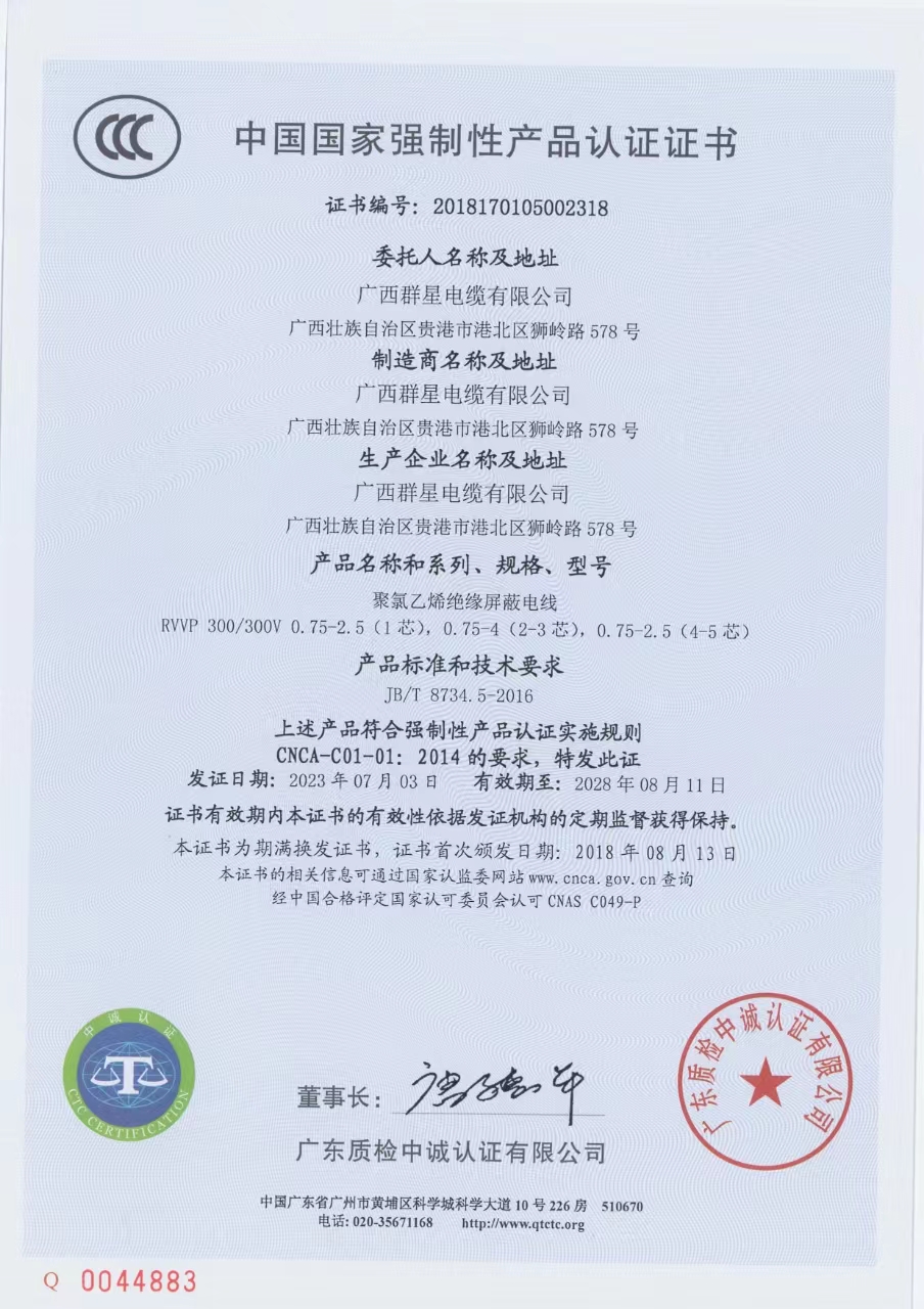 首頁 > 關(guān)于我們 >質(zhì)量認(rèn)證 >聚氯乙烯絕緣屏蔽電線3C認(rèn)證RVVP