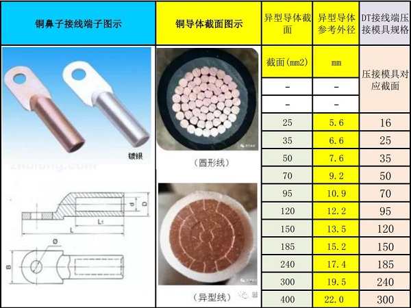 異型導(dǎo)體相對圓型導(dǎo)體因填充系數(shù)由90%提高至98%,導(dǎo)體外徑減小5%~8%,選用對應(yīng)規(guī)格的國標(biāo)接線端子時,可在壓接模具選用時比此規(guī)格導(dǎo)體小一個規(guī)格進(jìn)行壓接;